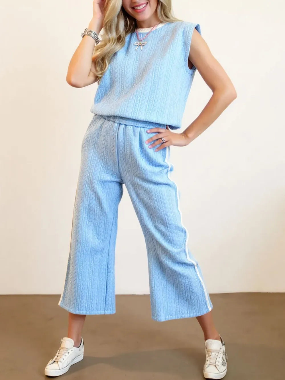 Oh Full Size Texture Contrast Trim Round Neck Top and Pants Set